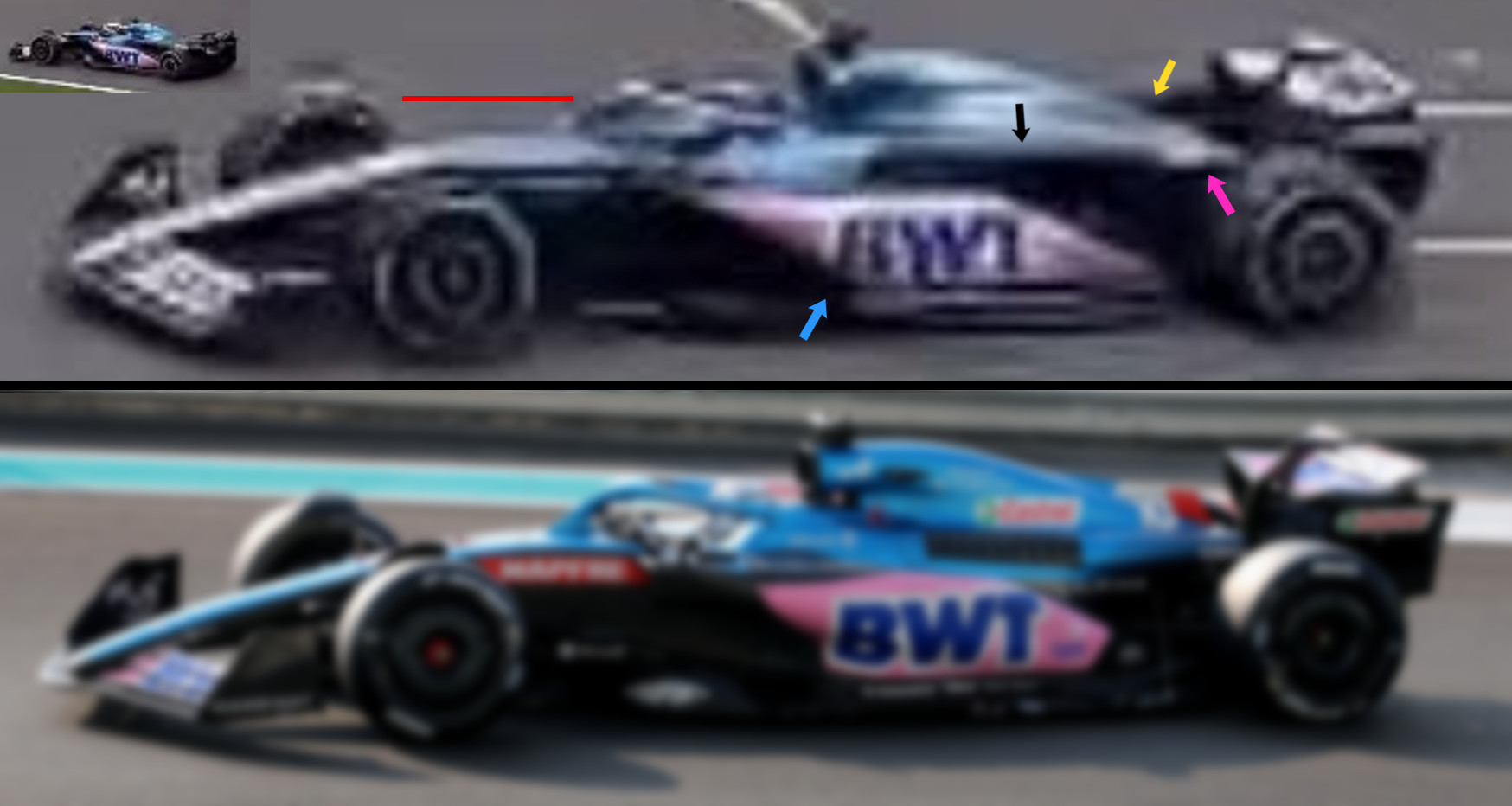 Also if you look closely there's more black at the back of the car than there was on the '22 car, so it's technically a different livery. Bear in mind also that a few weeks ago some technical person at Alpine gave an interview and said that visually speaking it wasn't going to be that different to last years' car. Albeit a lot of change at the rear was stated to be done, but who are we kidding, it's not something we'll see on such a low quality picture.