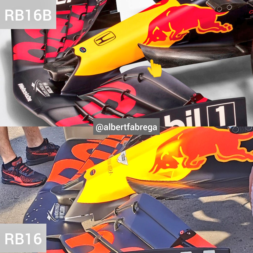 I completely agree! In particular, in the second picture, there should be a small horizontal wing just below the air scoop, but there's no trace of it. They might have had some problems, I hope they're not related to the engine (even though it is regularly running on the AT02, so it's unlikely that just Red Bull is having problems).
