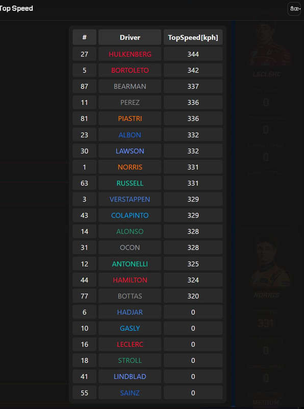I saw the below graphic earlier today. Can't speak to its accuracy, but if it's correct, Ferrari was not the 3rd fastest in terms of top speed, today.