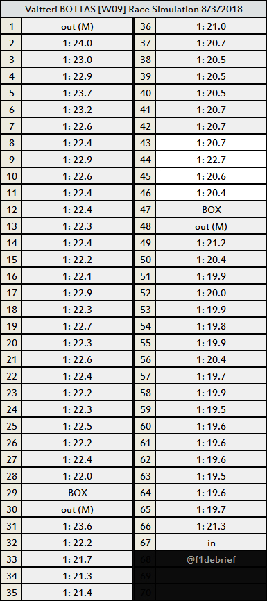 Translated: Vettel is now doing the times in his second stint that Bottas was doing in his first. Not good a good signal for Ferrari. But there are some variables to consider: The circuit might have gotten slightly slower (24.4 C now, compared to 20 when Bottas did it).
