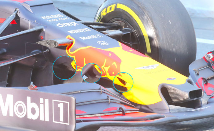 "I was very surprised by Adrian Newey, he did not use a front wing but he equipped the Red Bull with a front diffuser. The Red Bull is a car with two speakers. One is the rear one combined with the car body with rake trim and the other is the front wing which has an inclination of 10 ° - 12 ° with that shape has created a diffuser with a very large surface". "Newey has used a wing that generates vortices under the wing to create depression and increase the charge of the front axle without moving the flow upwards and without ruining the aerodynamic efficiency of the car. With this shape, it gives more air to the rear diffuser. It's a car with two diffusers, one that goes down straight, the back one, and the other, the front one, which works with a constant height in this way does not lose aerodynamic efficiency in the wake. He recreated a ground effect with the rake along the whole body of the car that even joins the one created by the front wing. It's a brilliant thing". Enrique Scalabroni.