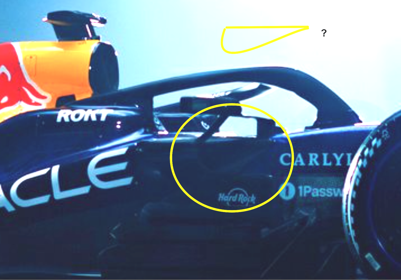 The shoulder inlet remains from the RB21 but now with an outlet that is pretty sizeable, visible above the sidepods but also has a body panel that is perhaps hiding something.
